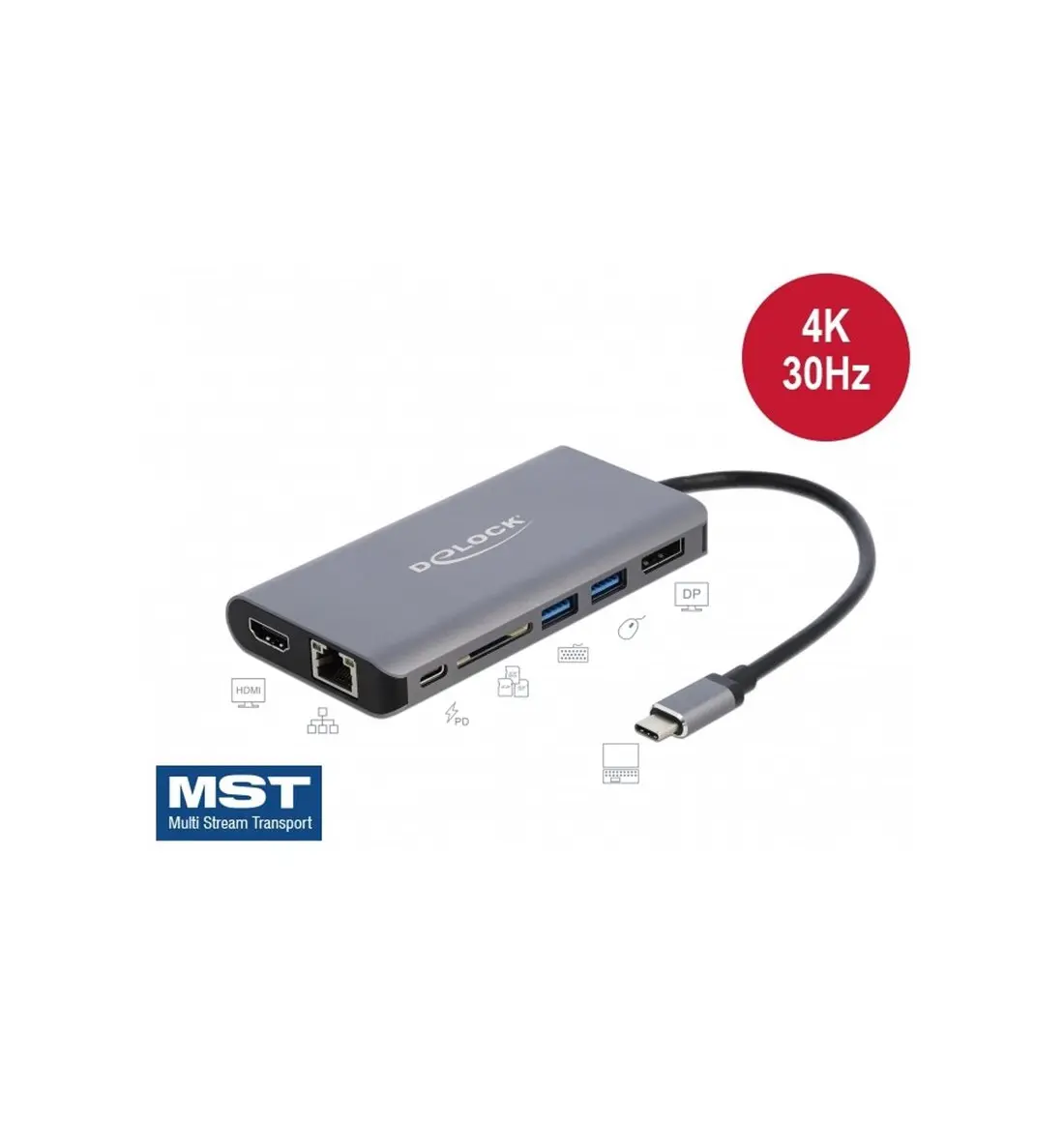 Il prodotto è un hub MTS e supporta la configurazione desktop estesa del DisplayPort. Questo consente di combinare più monitor in un unico grande display. In questo modo la docking station supporta una risoluzione massima di 1080p per monitor.