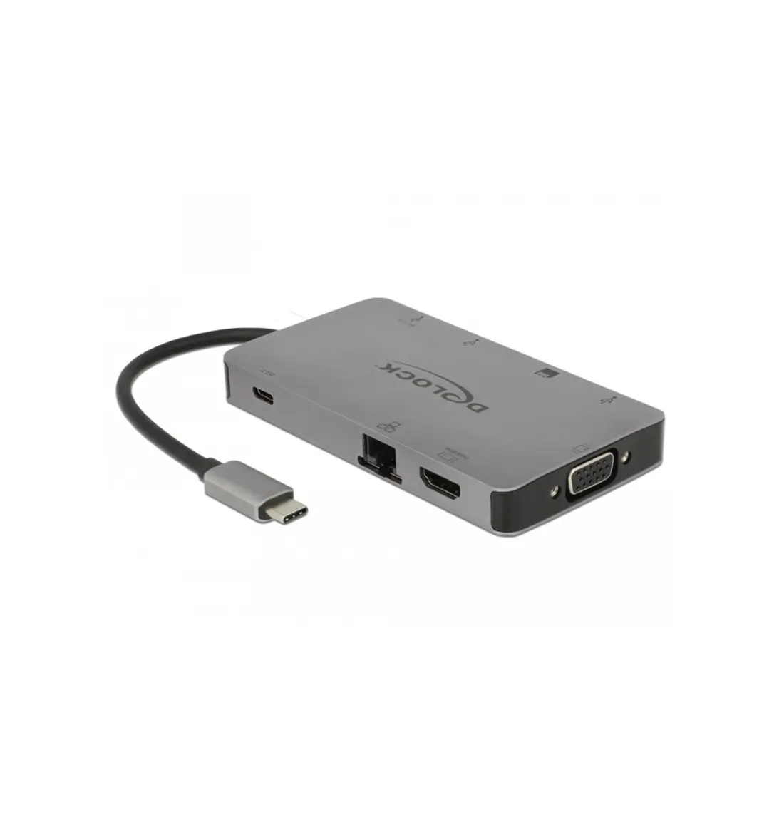 Questa docking station Delock può essere collegata ad un computer con una porta USB-C™ DP Alt Mode o Thunderbolt™ 3 e fornisce varie interfacce. Un monitor può essere utilizzato con l'uscita HDMI o VGA. Tre porte USB integrate consentono l'uso di periferiche e le connessioni per reti gigabit, così come un lettore di schede SD / micro SD card, ne completano le caratteristiche.