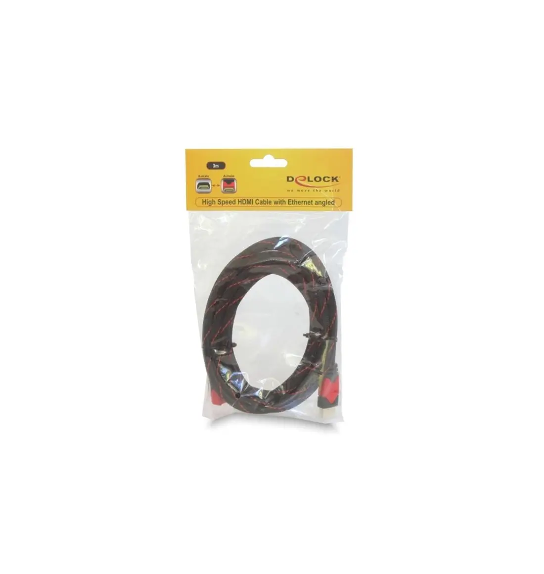 This High Speed HDMI with Ethernet cable by Delock complies with the latest HDMI standard and combines fast data transfer as well as audio-/ video- and Ethernet connection. Thus you can connect e.g. your PC or o DVD / Blu-ray drive to a monitor or TV. The angled connector helps to reach also a HDMI port which is difficult to access. The HDMI-A interface is downwards compatible to its forerunners and enables you to use your existing devices.